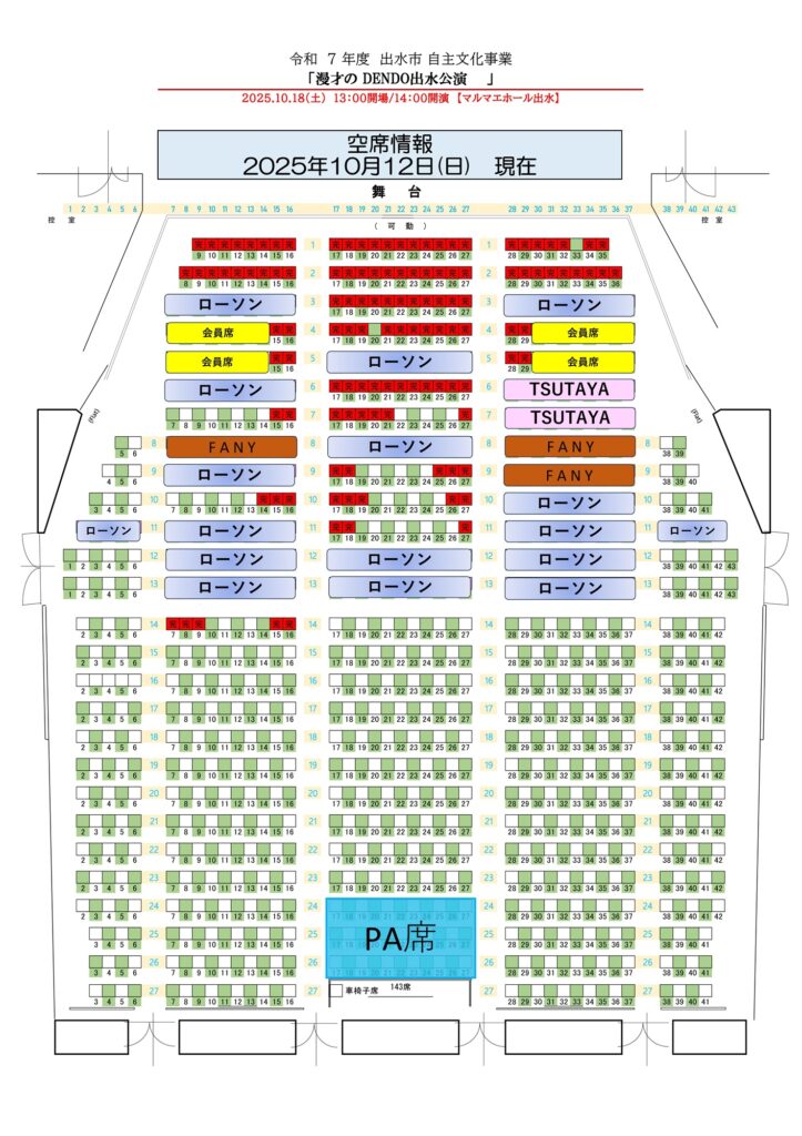 出水市自主文化事業「漫才のDENDO」チケット空席情報 更新日 2025年10月12日