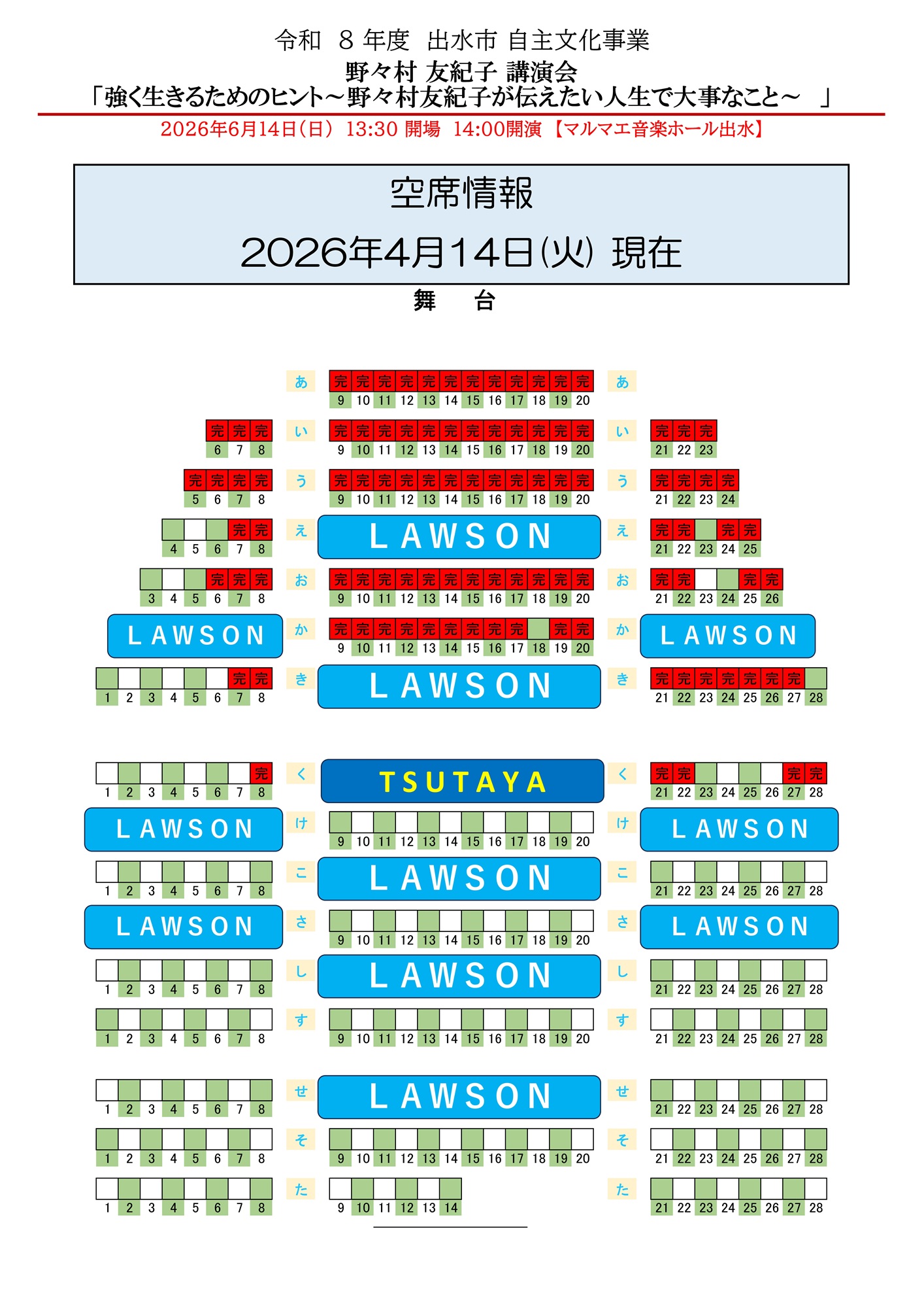 出水市自主文化事業「野々村友紀子講演会」チケット空席情報 更新日 2026年4月14日