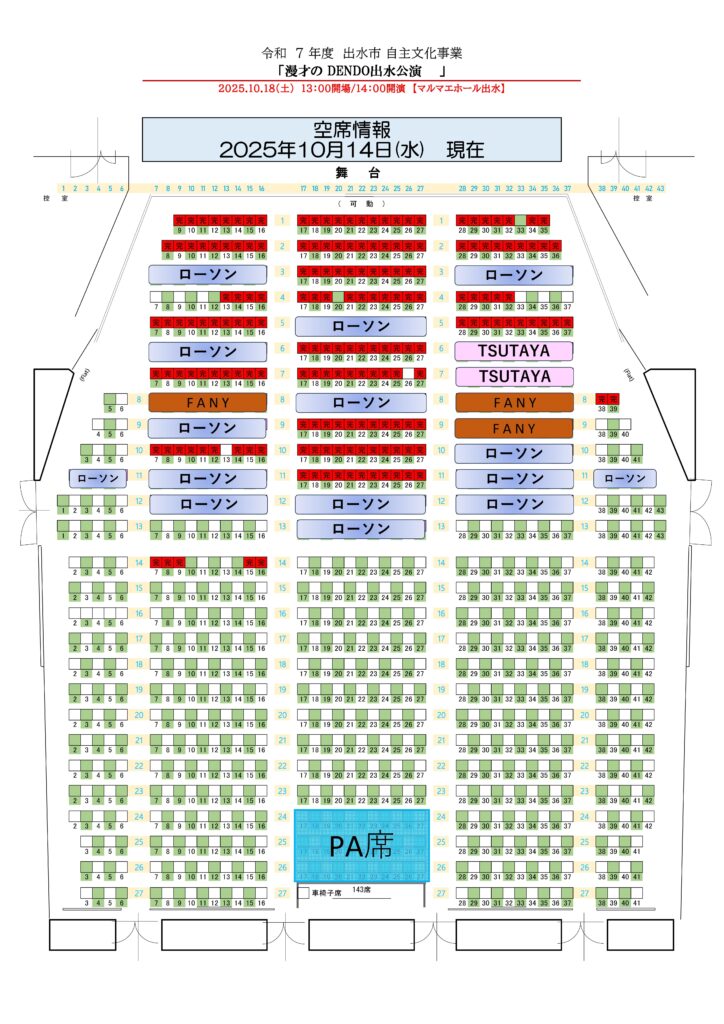 出水市自主文化事業「漫才のDENDO」チケット空席情報 更新日 2025年10月14日