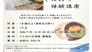 令和7年度短期公民館講座「そば打ち体験講座」の受講生を募集しています!受講を希望される方は、12月4日(木)17:00までに電話・FAXまたは公式LINEでお申し込みください。LINEでお申し込みをされる場合は、公民館講座と、送信ください。...
