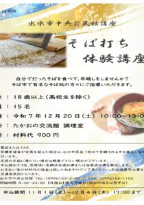令和7年度短期公民館講座「そば打ち体験講座」の受講生を募集しています!受講を希望される方は、12月4日(木)17:00までに電話・FAXまたは公式LINEでお申し込みください。LINEでお申し込みをされる場合は、公民館講座と、送信ください。...